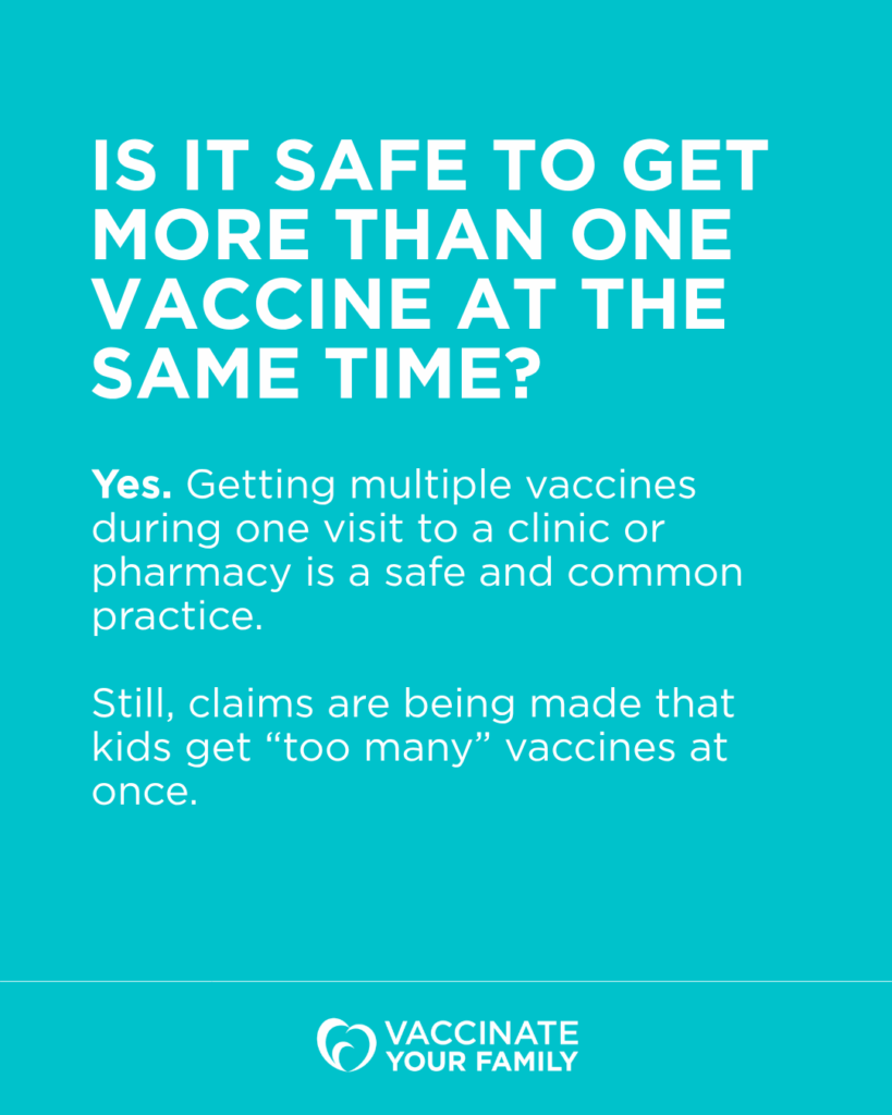 Please help share this important information! These social-ready graphics are downloadable. Here’s a suggested caption (or write your own!) → It is safe and common for kids (and adults) to get more than one vaccine at the same time. It doesn’t overwhelm the immune system. Children’s immune systems are exposed to more antigens every day than from the entire childhood vaccine schedule combined. From the time they’re born, babies’ immune systems have been fighting off bacteria and viruses constantly. And unlike the viruses and germs we’re exposed to in the real world, vaccines are studied alongside the other vaccines in the schedule before they’re approved.