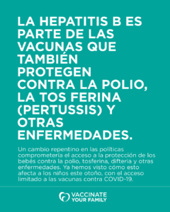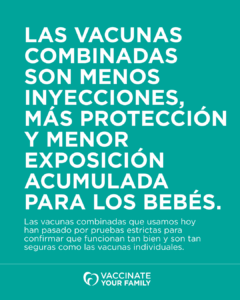 ¡Por favor comparta esta información importante! Las gráficas están disponibles para descargar y listas para usar en redes. No hay ninguna razón médica ni de seguridad para retrasar la vacuna de la hepatitis B ni para separar las vacunas combinadas en inyecciones por separado. Retrasar esa dosis puede causar dificultad para recibir las vacunas combinadas que protegen a los bebés contra polio, difteria, tosferina (pertussis) y más. Los recién nacidos quedarían más vulnerables a enfermedades, justo cuando más necesitan estar protegidos. Las vacunas combinadas son útiles porque significan menos inyecciones para los bebés y menos exposición total a los ingredientes que si se dieran por separado. Los ingredientes de las vacunas son seguros, han sido muy estudiados y están bien probados. Recibir menos inyecciones con más protección puede ayudar a que los padres estén más tranquilos.
