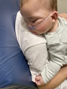 Since there’s no treatment for RSV, we were sent back home. But around 10 o’clock that night, Hunter’s breathing got worse—he started gasping for air. We rushed to the emergency room (ER) where they noticed his oxygen levels were very low and found he had pneumonia. They also did blood work that he did not take well. Hunter cried so hard that he passed out during the process.