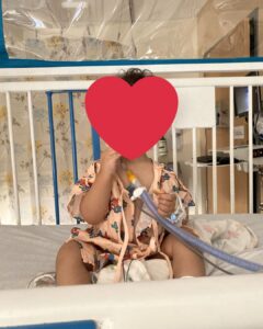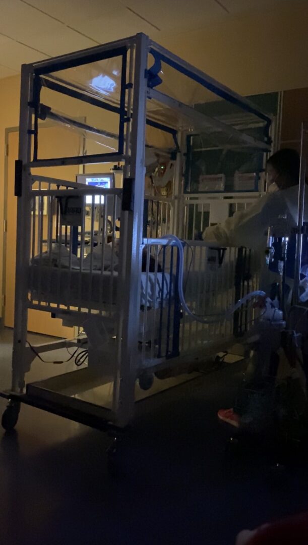 The care team told us that we weren’t alone—there were so many children in the hospital and intensive care unit (ICU) because of respiratory viruses. They connected us with the pulmonologist, and the respiratory therapy team came in and explained what the treatment device was going to be like. They put Laith in a special crib that had every tube you can imagine. He was on oxygen through his nose, and they placed an IV as back up if he needed it. We had to treat his room as a quarantine, so we were all in masks, gloves, and gowns. It wasn’t until the third day that they allowed us to drop those precautions.